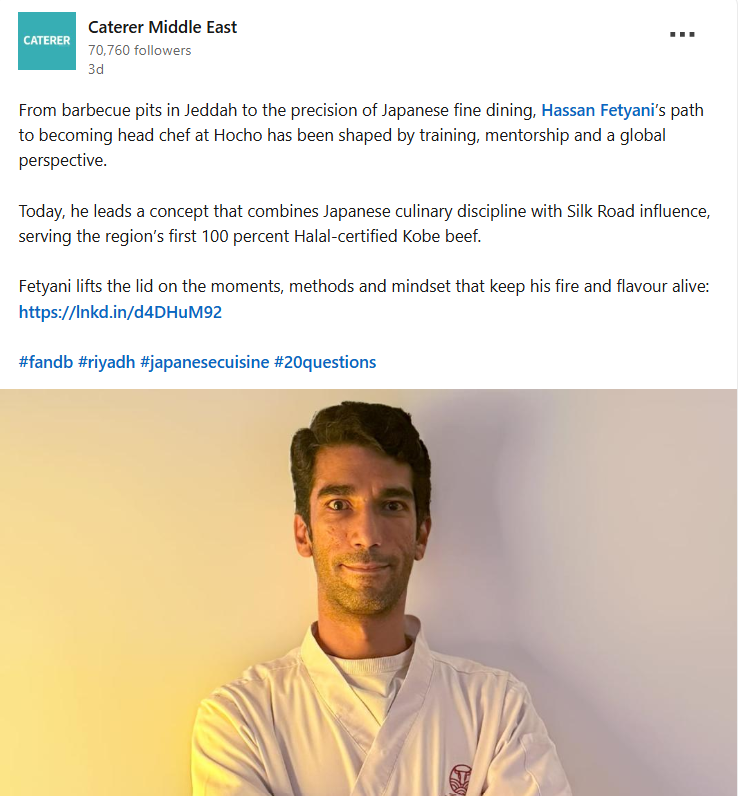 Caterer Middle East featured Chef Hassan Fetyani’s inspiring journey from Jeddah’s barbecue pits to leading Hocho’s Japanese fine dining experience.
